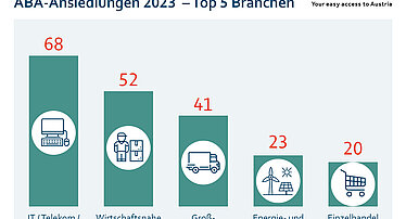 Die ABA-Abteilung INVEST in AUSTRIA hat im abgelaufenen Jahr 1.354 Anfragen internationaler Unternehmen beantwortet, Daraus konnten 496 laufende Ansiedlungs- und Expansionsprojekte betreut werden. Durch die 325 erfolgten Betriebsansiedelungen und -expansionen durch INVEST in AUSTRIA und den Regionalgesellschaften sollen insgesamt 2.419 Arbeitsplätze entstehen. 68 aller realisierten Unternehmensansiedlungen und -erweiterungen kamen aus dem Bereich IKT, gefolgt von wirtschaftsnahen Dienstleistungen (52) und Großhandel (41).