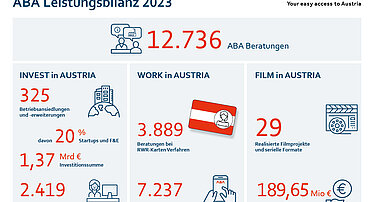 Die Austrian Business Agency (ABA) vermeldet mit mehr als 12.700 einen neuen Rekord an Beratungen und damit ein noch nie dagewesenes Interesse an den Services der Standortagentur. In allen drei Geschäftsbereichen INVEST in AUSTRIA, WORK in AUSTRIA und FILM in AUSTRIA verzeichnete die ABA starke Zuwächse. Im Zuge von 325 Betriebsansiedelungen und -expansionen wurden im Vorjahr von internationalen Unternehmen über 1,372 Milliarden Euro investiert, signifikant mehr als 2022. Vor allem auch im Bereich der Unterstützung der Wirtschaft beim Recruiting internationaler Fachkräfte waren die Leistungen der ABA gefragt – mit über 7.200 Unternehmen und Fachkräften gab es dazu Gespräche. Auch der Filmstandort Österreich boomt: im vergangenen Jahr wurden 29 Film- und Serienproduktionen von der ABA umgesetzt – so viele wie noch nie.